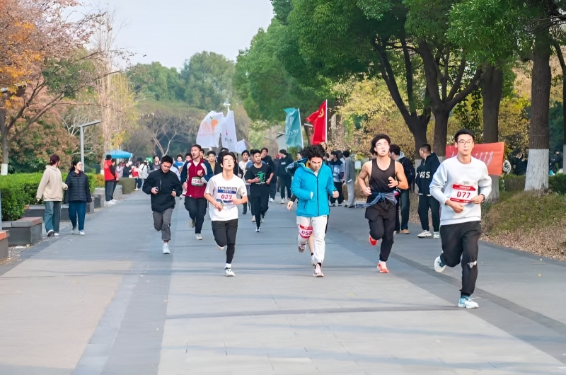下午2时开始检录工作,学生纷纷前往学院的检录处进行签到检录并领取号码簿,检录完毕学生开始进行热身工作。本次活动由举旗同学带头,环跑2圈后进入下沉广场,在下沉广场设置签名桁架,同学们可以在上面签名,直到排尾跑过龙门架宣布环跑活动结束。在活动正式开始前周老师再次强调各位同学要控制配速防止踩踏事件;同时打开步道乐跑APP记录本次跑步成绩。活动于14时45分正式开始,历时1小时圆满结束。