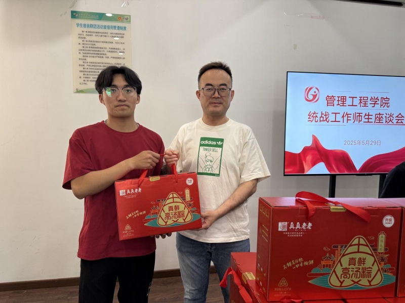 座谈会上,房亮老师细致询问了同学们近期的学习进展与生活状况,认真聆听了大家面临的现实困难与实际需求。他勉励在座学子:“眼前的困难是成长路上的磨砺石,学院始终是大家坚强的后盾,将竭尽所能为你们排忧解难,希望大家怀抱信心,专注学业,积极进取。”其恳切的话语传递出学院深切的关怀与坚定的支持力量。随后,王健凯、张兰老师亲手将饱含节日祝福与学院情谊的粽子礼盒送到每位学生手中,缕缕粽香瞬间弥漫会场,节日的暖意悄然流淌在每个人心间。来自少数民族的学生代表更分享了家乡独特的端午风俗,不同的文化印记在此交融碰撞,现场氛围温馨而热烈。