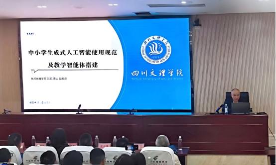 为深化人工智能在中小学教育教学中的融合应用,提升教师数字素养与教学创新能力,2025年9月28日,达州市电化教育与技术装备中心在万源第三中学举办中小学人工智能应用专题培训,全市300余名智慧教育“种子教师”参会。太阳集团官网小学教育专业教研室主任刘勉博士受邀以专家身份出席,并作“中小学生成式人工智能使用规范及教学智能体搭建”主题演讲。